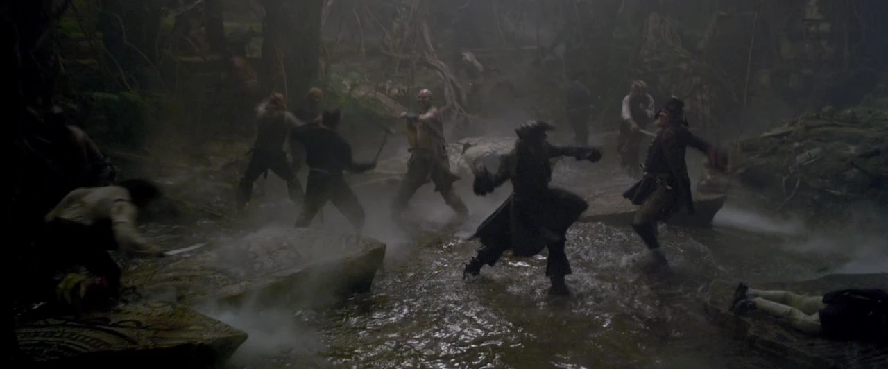 Proprio mentre tutti estraggono le armi per combattere, Jack Sparrow interrompe il tutto irrompendo tra le parti, fermando brevemente il combattimento. Egli mette in discussione il fatto che entrambe le parti debbano combattere solo per il desiderio di Barbossa di uccidere Barbanera, e suggerisce di lasciare che i capitani si combattano, mentre tutti gli altri si rilassino, guardino, bevano e facciano scommesse. Solo Scrum accetta la proposta. Tuttavia, Barbossa rifiuta l'idea di Sparrow e ordina ai suoi uomini di attaccare e Barbanera ordina ai suoi uomini di fare altrettanto. I due capitani ingaggiano così un combattimento all'ultimo sangue mentre i pirati di Barbanera combattono contro gli uomini di Barbossa.