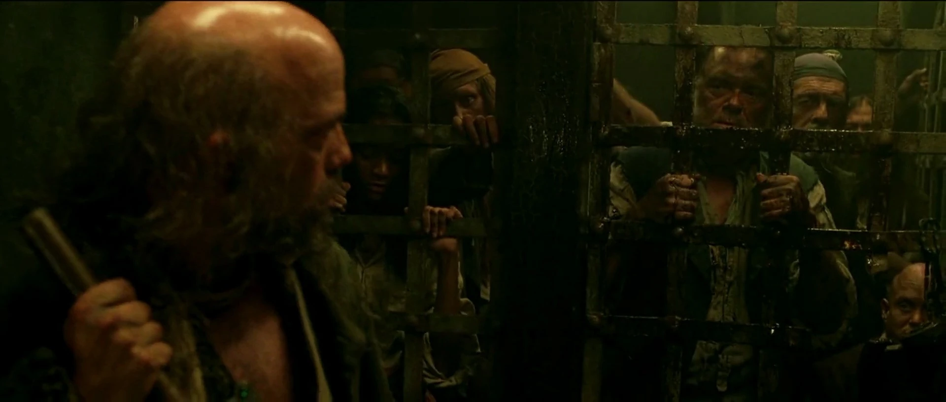 La ciurma della Perla Nera nelle gabbie sull'Isola dei Pelegostos.