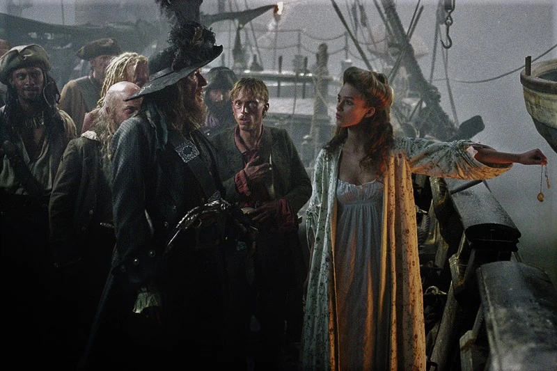 Durante il viaggio, Barbossa costringe Elizabeth ad indossare un elegante abito purpureo e a cenare con lui. Durante la cena Elizabeth chiede a Barbossa il motivo per il quale non la liberano, avendo già il medaglione. Allora Barbossa le racconta la storia del tesoro di Cortés e della maledizione che grava su di esso: chiunque prelevi un solo pezzo dal forziere di pietra verrà maledetto per l'eternità. L'unico modo per rompere la maledizione è restituire ogni singolo pezzo al forziere con un tributo di sangue di chi lo ha prelevato. Ora manca un solo pezzo e un solo tributo di sangue...quello di Elizabeth. Spaventata, la ragazza cerca di uscire dalla cabina di Barbossa ma quest'ultimo la insegue. Elizabeth lo colpisce con un coltello da cucina che aveva preso durante la loro conversazione. Barbossa non muore e prende il coltello e chiede a Elizabeth che cosa avrebbe fatto dopo averlo ucciso. Elizabeth, incredula, esce dalla cabina e scappa sul ponte della Perla Nera dove vede i membri della ciurma come non-morti rimanendone terrorizzata. Barbossa esce dalla cabina diventando un non-morto e inizia a bere del vino. Elizabeth si ripara nella cabina per il resto del viaggio mentre Barbossa ordina alla ciurma di rimettersi al lavoro.