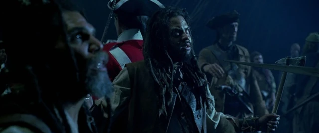 Arrivati all'Isla de Muerta, Capitan Barbossa esegue il rituale per spezzare la maledizione. Quando Barbossa lascia cadere nel forziere il medaglione bagnato con il sangue di Elizabeth lui e la ciurma non si sentono diversi. Pintel chiede come devono fare a capire se la maledizione è stata spezzata e allora Barbossa prende la sua pistola e gli spara. Pintel non muore e la ciurma capisce che la maledizione è ancora attiva. Barbossa chiede a Elizabeth se lei non è la figlia di William Turner e lei dice di non esserlo. Un frustato Barbossa colpisce Elizabeth facendola cadere a terra. In un primo momento la ciurma se la prende con Pintel e Ragetti per aver preso la persona sbagliata per poi attaccare Barbossa accusandolo di averli portato sull'Isla de Muerta e di averli fatti maledire. Tuttavia, quando Barbossa prende la sua spada e dice alla ciurma che chi ha qualcosa da ridire può vedersela con lui, nessuno membro della ciurma osa sfidarlo. La discussione viene presto interrotta quando Jack la scimmia fa notare a Barbossa che Elizabeth è fuggita con il medaglione. Barbossa ordina alla ciurma di trovare il medaglione.