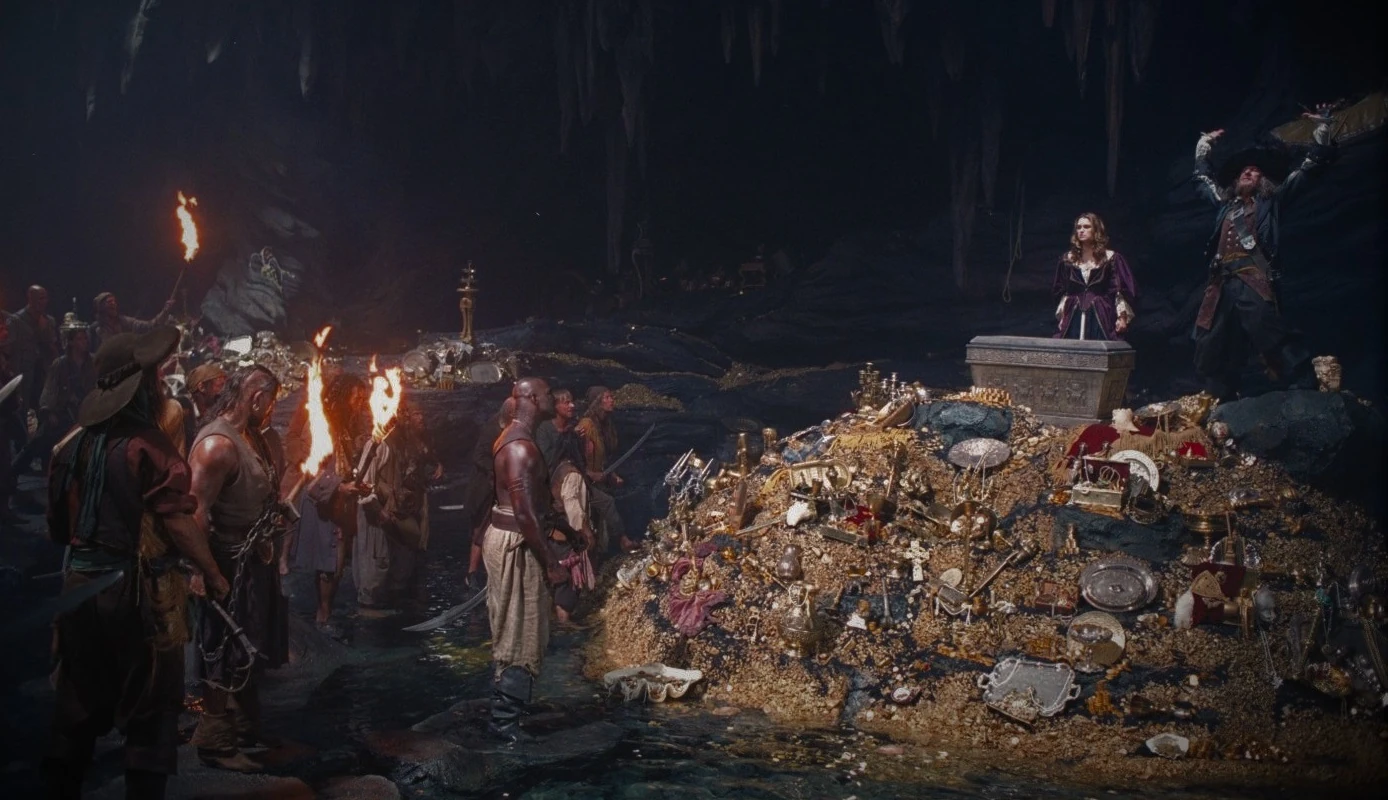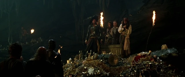 In seguito Elizabeth raggiunge la grotta dell'Isla de Muerta e aiuta Will a combattere contro Monk, Clubba e Jacoby mentre Sparrow, che si rivela anch'egli essere maledetto in quanto aveva rubato un medaglione mentre negoziava con Barbossa, continua a duellare con quest'ultimo. Dopo che Will ed Elizabeth sconfiggono Monk, Clubba e Jacoby, Jack bagna il suo medaglione con il suo sangue e lo lancia a Will che lo getta, assieme al suo medaglione bagnato con il suo sangue, nel forziere spezzando la maledizione al momento più opportuno. Jack spara a Barbossa con il colpo di pistola conservato per 10 anni e questo, spezzata la maledizione, non potendo sopravvivere al colpo di pistola, muore. A bordo della Dauntless anche i membri della ciurma della Perla Nera si accorgono che la maledizione è stata spezzata. Koehler, che è stato ferito a morte da Norrington, cade a terra morto mentre gli altri membri della ciurma si arrendono ai soldati britannici. La ciurma viene imprigionata e portata a Port Royal dove la maggior parte di essa viene impiccata. Soltanto pochi membri della ciurma, tra cui Pintel e Ragetti, riescono a fuggire dalle celle di Fort Charles.