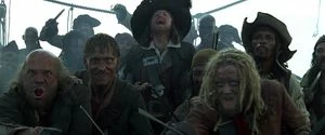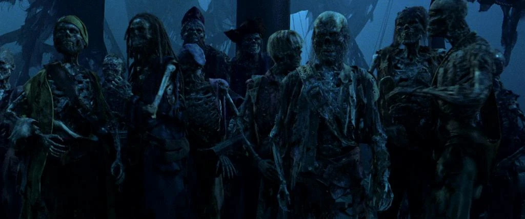 La ciurma di Capitan Barbossa a bordo della Perla Nera
