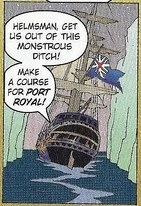Il capitano Oliver Randolph Pynce-Jones III riesce a catturare Jack Sparrow e lo porta bordo dell'HMS Achilles per poi farlo legare all'albero della nave. Poi la nave parte per raggiungere Port Royal viaggiando attraverso la baia dei contrabbandieri. A bordo Jack incontra una sua vecchia conoscenza, Dimity Mipps. Mipps inizia a parlare con Jack ma il capitano, quando lo vede parlare con il prigioniero, decide di punirlo. Prima di poterlo fare, si sente una risata in tutta la nave.Sulla nave sale Christopher Syn che cavalca un cavallo. Syn si definisce uno spaventapasseri e punta la sua pistola al capitano. Poi Syn ordina che Jack venga liberato e Mipps lo libera. Jack cade nel ponte inferiore della nave mentre Syn combatte con gli uomini di Pynce-Jones. Poi Syn salva Jack e gli fa accendere un cannone puntato al ponte principale dell'HMS Achilles. Jack fa fuoco con il cannone e dopo un sol colpo ricevuto, l'HMS Achilles inizia ad affondare. Jack, Syn e la ciurma fuggono a terra mentre Pynce-Jones preferisce affondare con la sua nave. Tuttavia le acque dell'insenatura sono abbastanza basse da impedire la morte del capitano per affogamento. Quindi l'HMS Achilles affonda nell'acqua dell'insenatura.