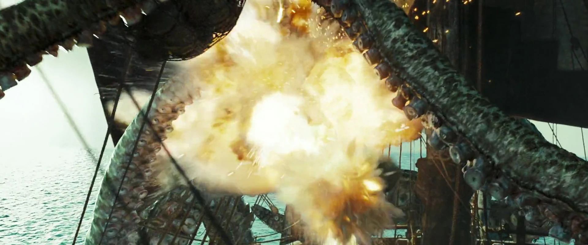 Tuttavia, Will, che sa che il calamaro ritornerà, escogita un piano per abbatterlo: fa raccogliere tutti i barili di polvere da sparo, issarli sopra il ponte e, appena prima che il Kraken stritoli lo scafo, farli esplodere per ucciderlo. La Perla Nera è però a corto di barili di polvere: sei barili non sono sufficienti allo scopo. Turner ordina di usare anche i barili di rum e la ciurma, a malincuore, esegue l'ordine.